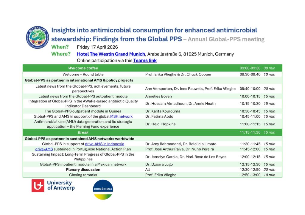 Join us for our annual Global-PPS meeting, held in conjunction with ESCMID Global 2026. Save the date for Friday, 17 April 2026, from 9:30 AM to 1:00 PM (CEST). The meeting will feature discussions on Global-PPS results, strategy, achievements, and best practices in both inpatient and outpatient settings. It will bring together Global-PPS stakeholders from around the world to share experiences, explore new ideas, and strengthen an inspiring Global-PPS community.